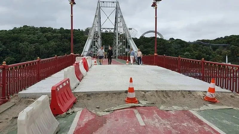 Ранее бетонные балласты, которые прослужили девять лет, и отвалились 2 августа, были под мостом, у опор. Сейчас же коммунальщики проложили заводские дорожные плиты и смастерили пандусы из деревянных досок, сообщили dtp.kiev.ua.