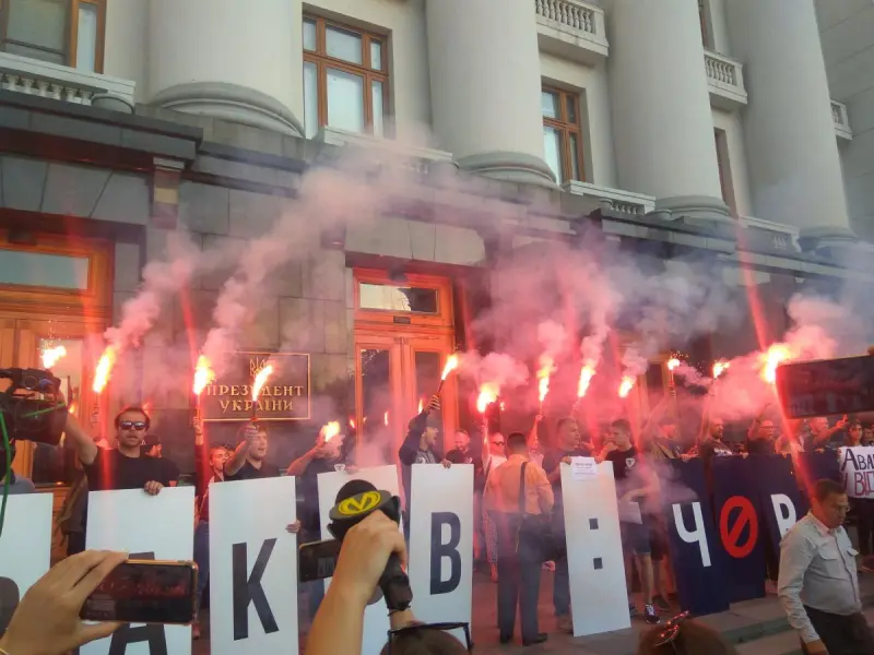 На Банковую несколько сотен активистов пришли с плакатами «Аваков-черт», «Володя! Нам Аваков не нужен. А тебе? АвакOff», «Авакова в отставку», «Зе, позвони по поводу этого черта».