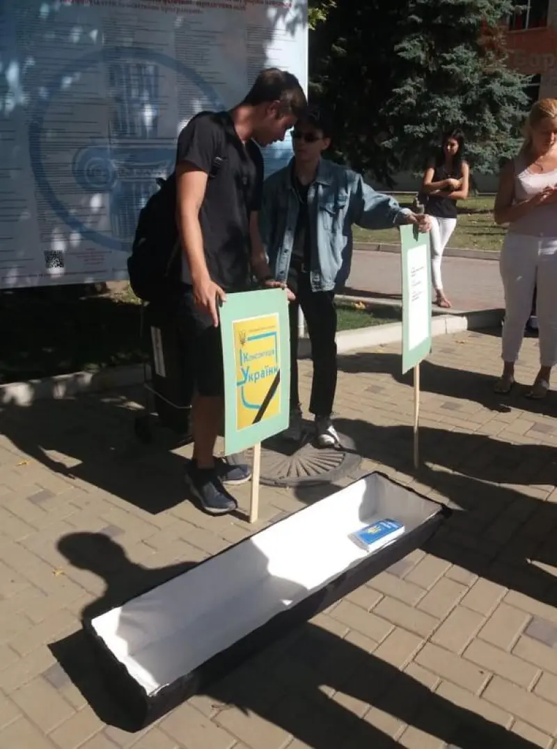 Учащиеся факультета журналистики пришли с импровизированным черным гробом, в который положили Конституцию Украины. Затем они достали колонку и включили похоронную музыку, сообщает местное издание ZаБор.