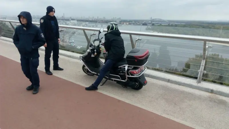 На многострадальном мосту Кличко в центре Киева, который то и дело идет трещинами, поймали водителя с явными признакам опьянения. Горе-«байкер» решил прокатиться на електромопеде по велодорожке пешеходно-велосипедного моста.