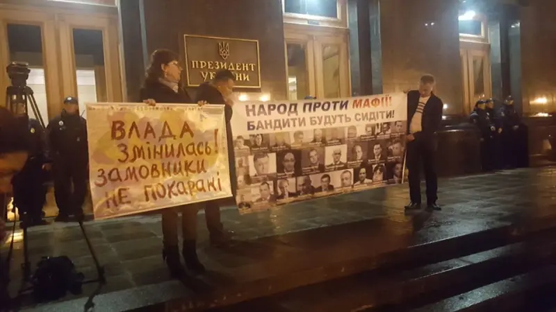 Они принесли плакаты с надписями «Влада поменялась, а заказчики не наказаны», «Народ против мафии, бандиты будут сидеть», «Авакова в отставку».