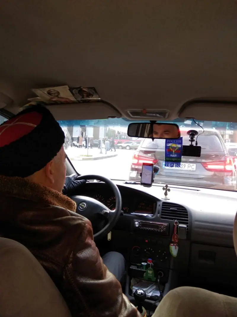 Таксист разьезжал по населенному пункту в авто на евробляхах, а в салоне повесил значок с российским флагом и надписью «ВДВ Россия». Мало того, мужчина редко расставался с кубанкой – это головной убор кубанских казаков.
