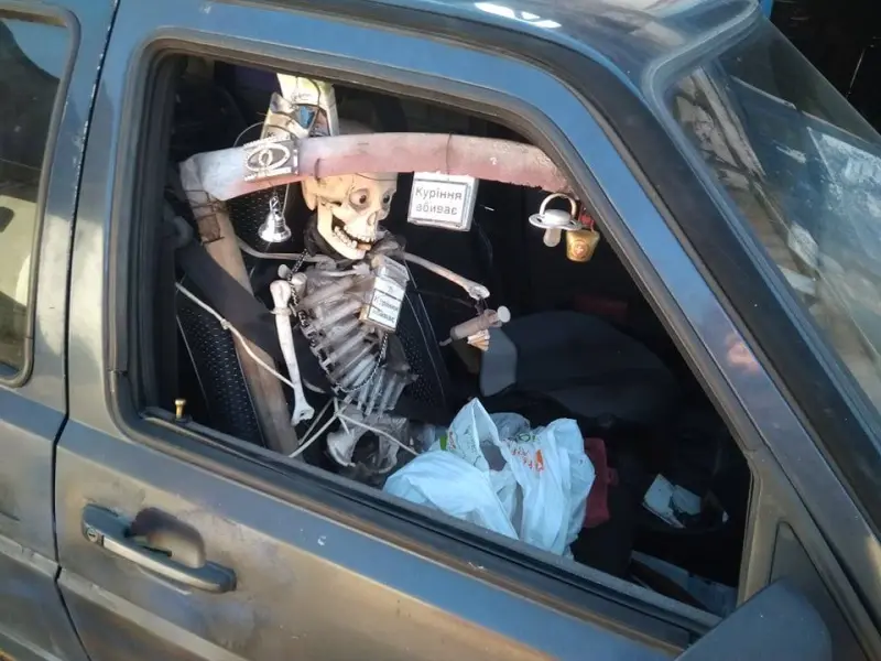 Жители Киева заметили в столицы легковой автомобиль, в котором находился необычный пассажир. Так, очевидцев удивил скелет, увешанный пустыми пачками из-под сигарет, на пассажирском месте возле водителя.