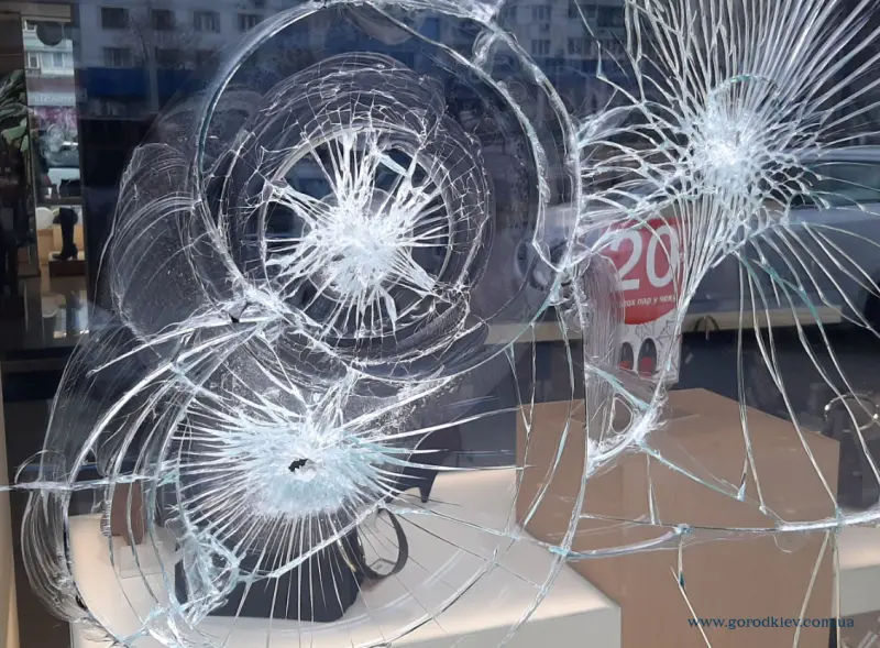 В ночь на среду, 13 ноября, в столице Украины у метро Политехнический институт злоумышленники расстреляли витрину обувного магазина Carlo Pazolini, который находится по адресу - проспект Победы, 19.