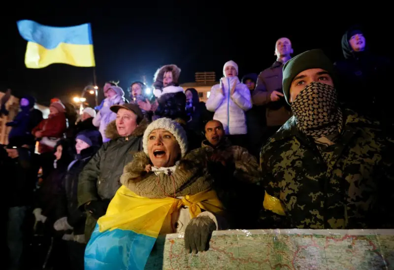 Вече проходит под лозунгом Ми маємо гідність! На площади собрались также участники акции, организованной силами Движения сопротивления капитуляции, которые требуют прекращения разведения войск на линии разграничения, а также отмены реализации формулы Штайнмайера. Протестующие пометили своих единомышленников желтым скотчем на рукаве.