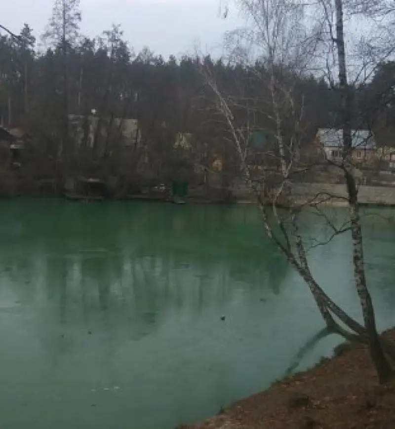 Неожиданно в селе Горенка под Киевом произошла экологичествая катастрофа - озеро стало кислотно-зеленым.