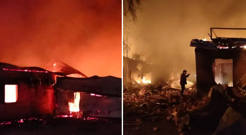 В результате вражеского удара возникли разрушения и возгорание ангаров и трехэтажного здания предприятия. Пожары потушены.