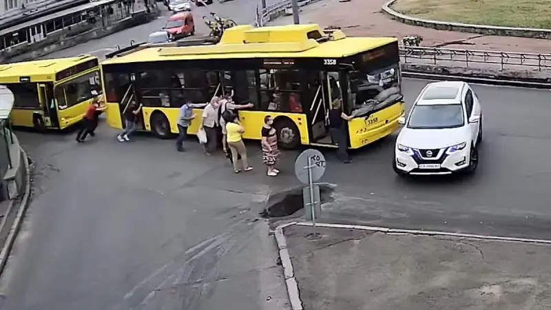 В столице на Севастопольской площади пассажиры толкали троллейбус, а он врезался в Nissan, который пытался объехать общественный транспорт. Вероятно троллейбус поломался, и добрые самаритяне решили помочь водителю.
