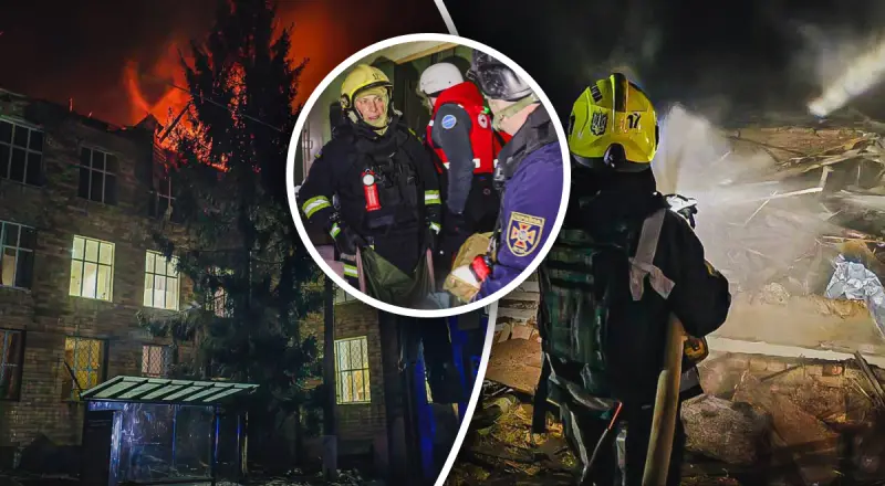 "Возникло четыре очага пожаров. Один из беспилотников попал в трехэтажное здание медучреждения, вызвав пожар на крыше. Совместными усилиями спасателей, полиции, медиков и волонтеров эвакуированы 64 человека, среди них - 56 пациентов и ребенок. По предварительным данным, пострадали 7 человек", - говорится в сообщении.