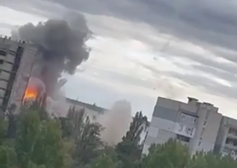 В одном из районов города в месте прилета поднимается столб дыма. Видео опубликовано в Telegram.