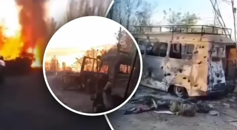 В этом полке, среди прочего, были КАМАЗы и УАЗы. Батальон "Атал" практически полностью уничтожен, жалуются россияне. На видео с места удара видно множество горящих машин.
