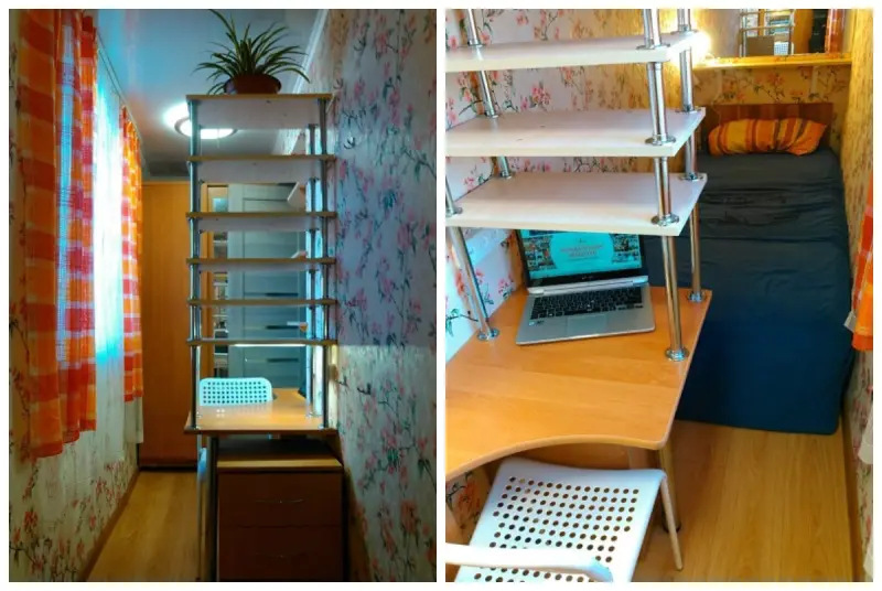 В комнату переделали балкон или лоджию. Она настолько маленькая, что там едва уместилось кровать, небольшой столик и этажерка для вещей. В самом объявлении указывается, что в комнатке еще есть двустворчатый шкаф с зеркалом и небольшая антресоль. Вместо кровати там стоит широкое раскладное кресло, которое можно трансформировать в спальное место.