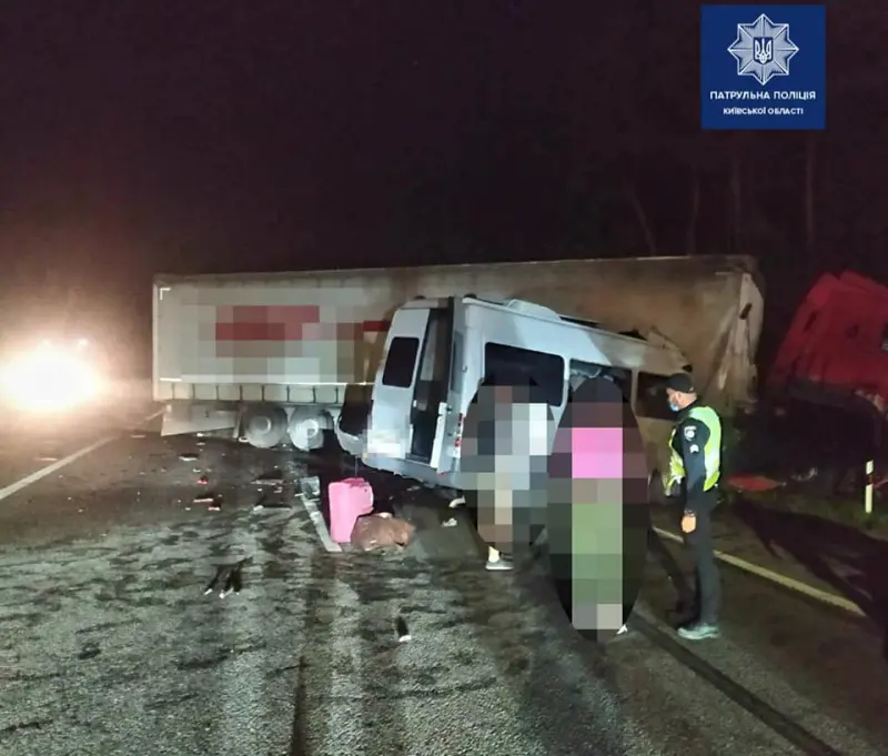 Внаслідок аварії 5 людей загинули, ще 20 - дістали травм. Постраждалих, які отримали травми різного ступеня тяжкості, доставили в лікарню. Про це повідомляє патрульна поліція Київської області у Facebook.