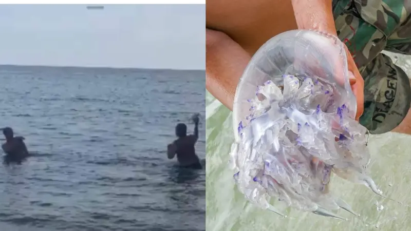 На популярном украинском курорте Кирилловка туристы, которым не дает покоя огромное количество медуз, придумали с ними новое развлечение. Двое парней, стоя по пояс в Азовском море, устроили "медузные бомбочки".