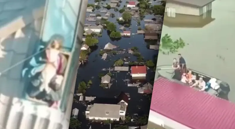 Российские оккупанты уничтожили Каховскую ГЭС, что привело к затоплению большого количества населенных пунктов. Во временно оккупированных Олешках Херсонской области люди вынуждены сидеть на крышах собственных домов, чтобы хоть как-то спастись. Украинские военные заметили в одном из таких домов женщину с детьми.