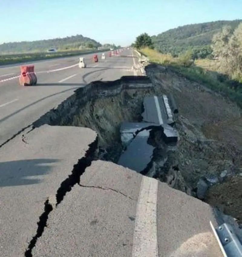 В Подольском районе Одесской области фиксировались затяжные осадки. В результате наводнения на трассе Киев-Одесса произошел сильный оползень из-за которого обрушилась проезжая часть.