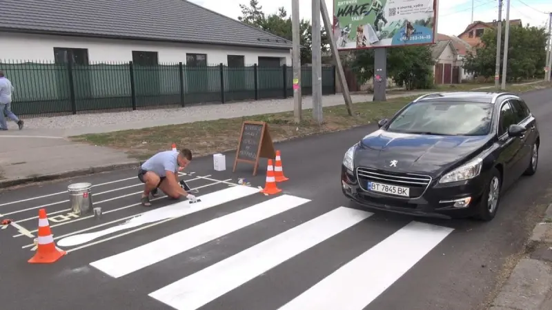 Чтобы правильно нанести разметку, Юрий изучал информацию в Интернете, а "зебру" сделал за всеми государственными нормативами – каждая полоса шириной в 50 см. В верхнем слое краски мужчина посыпал стеклошарики, чтобы "зебру" было видно ночью. Краска, которую использовал Юрий, сохнет не более 15 минут.