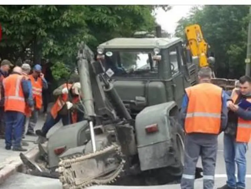 У Києві в середу, 27 травня, в районі вулиці Предславинська (Печерський район Києва) через яму в асфальті під землю провалився трактор співробітників комунальних служб.