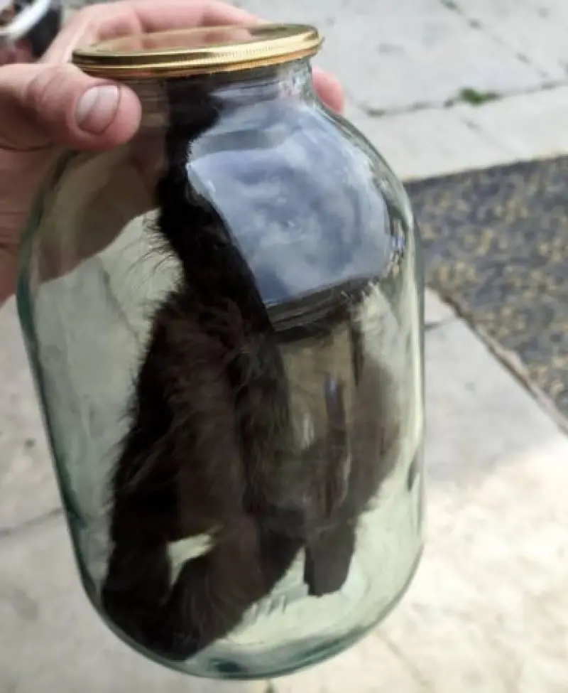 На відео чітко видно, що чорне кошеня знаходиться у банці, яку закрили металевою кришкою.