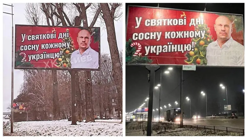 "В праздничные дни сосну каждому украинцу", - было написано на афишах. Кроме этого, рядом с фразой были фото нардепа из ОПЗЖ Ильи Кивы и экс-"слуги народа" Александра Дубинского.