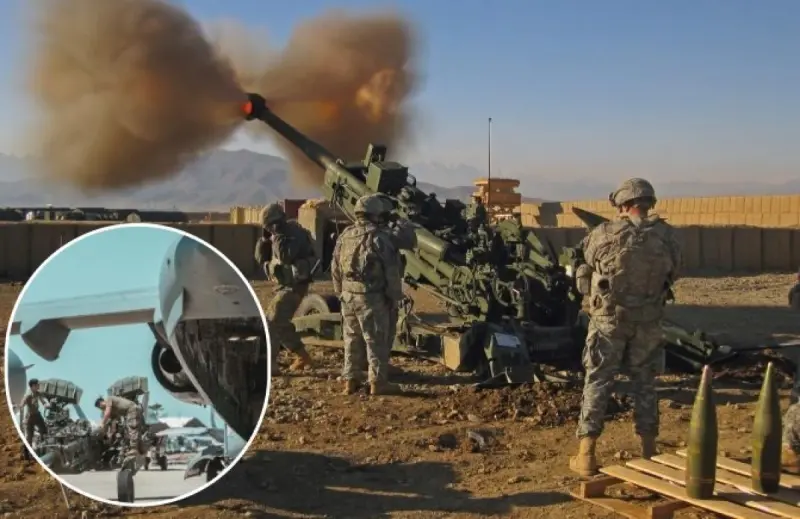 Груз с 155-миллиметровыми буксируемыми гаубицами M777 погрузили в военно-транспортный самолет на базе в Калифорнии.