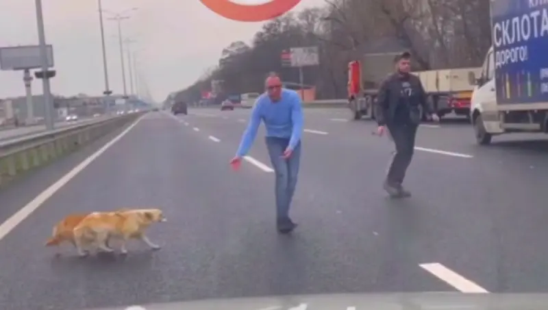 Под Киевом на Бориспольском шоссе неравнодушный водитель перекрыл движение транспорта, чтобы перевести через дорогу двоих собак.