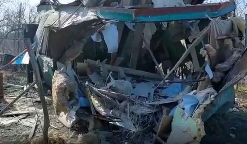 Обратим внимание, что к разрушенному вагончику приставлен флаг РФ, вероятно для того, чтобы продемонстрировать его российскую принадлежность. Однако он явно не сохранился бы в результате взрыва.