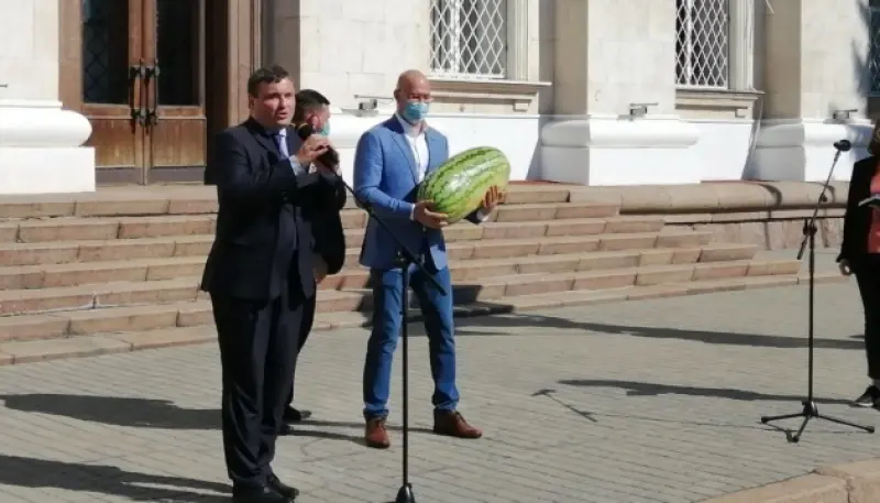 Під час офіційного візиту до Херсонської області прем'єр-міністр Денис Шмигаль отримав найбільший кавун літнього сезону 2020 року.