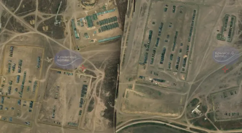 Большая российская база расположена в 2,5 км восточнее озера Капчик на Керченском полуострове. На ней находится также много военной техники.