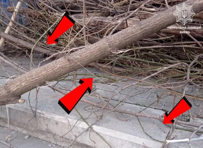 В Киеве на Печерске местный житель во время прогулки заметил растяжку, которая была между сложенных сухих веток. Там же лежал и предмет, похожий на гранату.