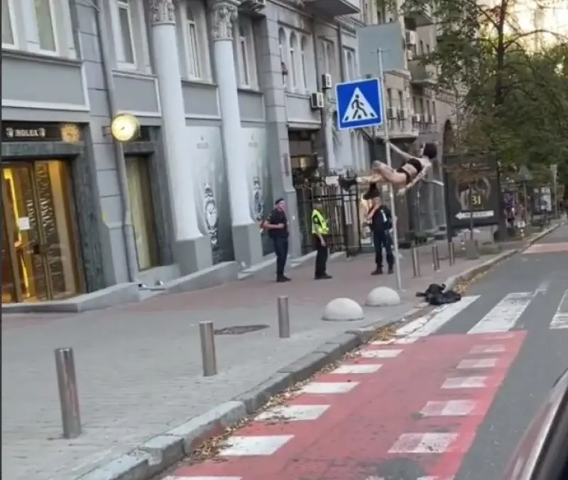 В центре Киева девушка в нижнем белье устроила танцы на шесте, выбрав вместо пилона дорожный знак пешеходного перехода.