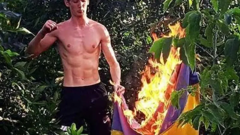 Парень выложил фото в ленту Instagram, где он с оголенным торсом держит горящий украинский флаг, подняв кулак. В этот же день он выложил видео-извинения.
