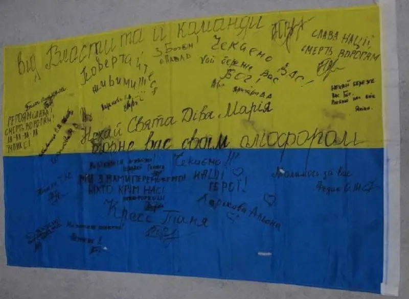 Первый флаг Украины с номером в каталоге 20894853, посеченный осколками самоходной реактивной системы залпового огня РСЗО "Град", был привезен военным корреспондентом "Комсомольской правды" Стешиным Д. А. "из командировки в "ДНР", с места боев за аэропорт".