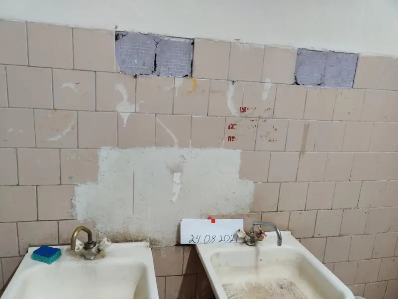 Позже появились свежие фотографии из общежития. Оказалось, что условия на самом деле очень далеки от идеала - везде отваливается плитка, а раковины и унитазы в плохом состоянии. На каждом из фото, опубликованном РБК-Украина, есть бумажка с датой снимка — 24 августа 2021 года.