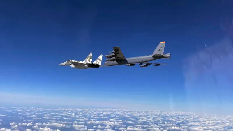 Як сказано в заяві відомства , три бомбардувальники B-52 Stratofortress ВВС США з 5-го бомбардувального крила бази ВПС Майнот продемонстрували навчання з інтеграції з українськими винищувачами в повітряному просторі України.