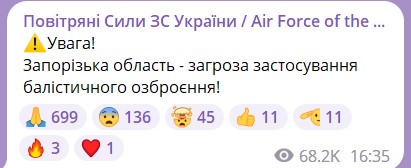 О воздушной тревоги сообщили в Telegram-канале главы Запорожской ОВА Юрия Малашко.