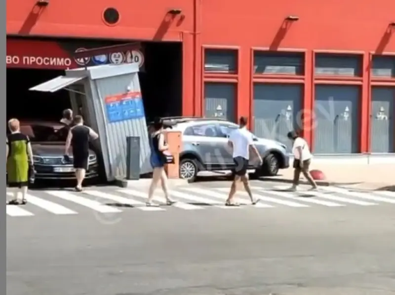 На этом неприятности не закончились, потому что покосившаяся будка парковщика придавила авто, выезжавшее с парковки.
