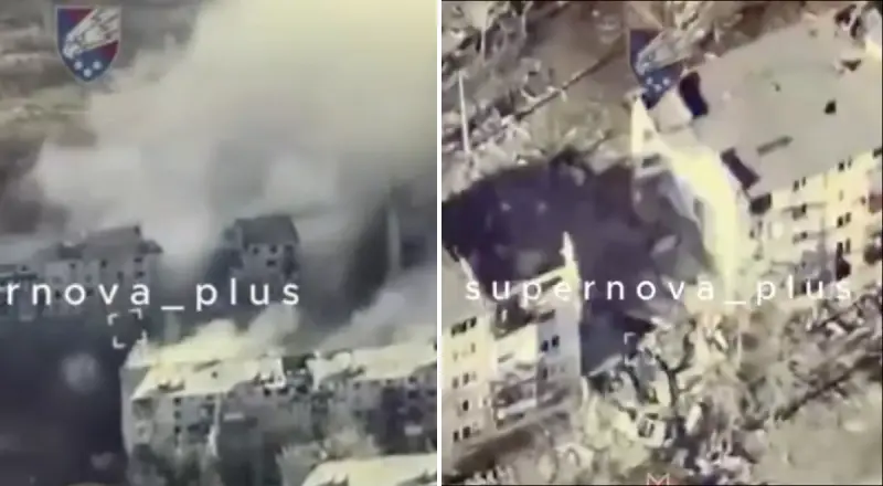 Недавний удар снял украинский беспилотник сверху. Боеприпас глубокого поражения — ракета, бомба или крылатая ракета — поразила заброшенное здание. В результате обрушилась целая секция высотки.