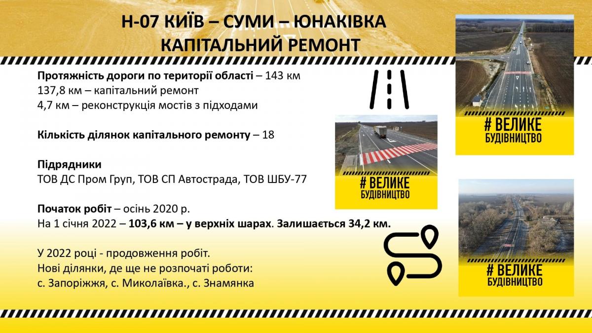 Так, одним из приоритетных направлений работы на текущий год является продолжение масштабных работ на дороге Н-07 Киев – Сумы – Юнаковка, протяженность которой в пределах области составляет 143 км. Количество участков капитального ремонта – 18, участков реконструкции – 5. На начало года в верхних слоях дорожного покрытия уже 103,6 км трассы. Новые участки дороги, где будут в этом году проводить работы, – с. Запорожье, с. Николаевка и с. Знаменка.