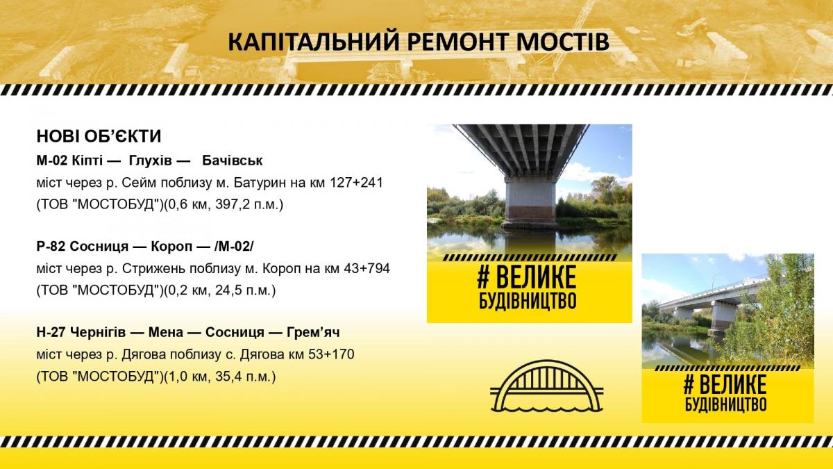 Также в области проведут масштабные роботы и на мостах. Среди прочего, планируется установить новые мостовые переходы через Сейм вблизи г. Батурин и через р. Стрижень вблизи г. Короп.