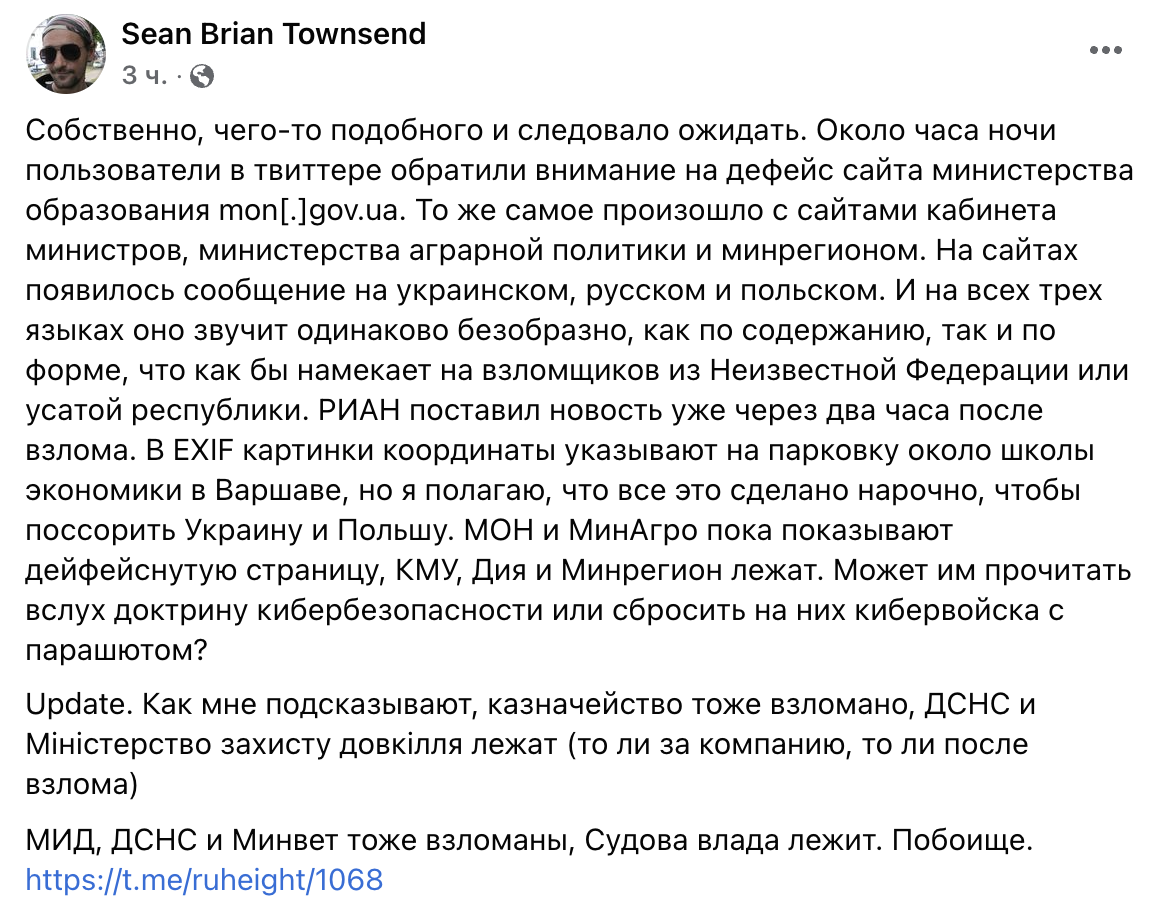 Тем временем советник по вопросам кибербезопасности украинской политической партии Демократична Сокира Андрей Баранович написал на своей странице в Facebook, что на сайтах госструктур начали ночью всплывать сообщения при входе с таким содержанием: