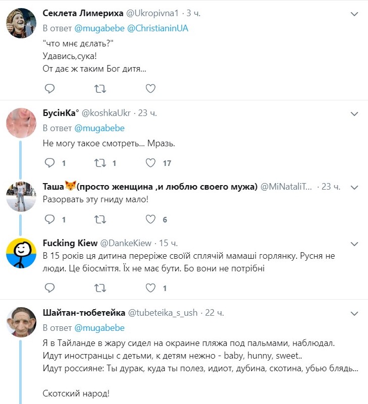 "Нормальный будущий россгвардеец (ка) растет, потом будет мстить либералам за детские обиды. РФ - вечный двигатель ненависти", "Она однозначно тупорылая", "Обрубить руки, по самое еб*ло!", "Это ад!", "Я бы этой бл*ди отбил бы башку на*уй", "Еб*чий биомусор!", "Какой кошмар! Бедный ребенок, угораздило родиться в ублюдочной семье!", - писали возмущенные юзеры.