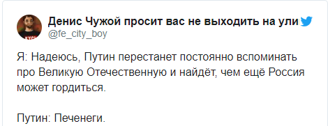 Упоминание кочевых племен и сравнение их с пандемией спровоцировало взрыв шуток и сарказма в российском сегменте соцсетей. Одни россияне требовали торжественно отпраздновать победу над печенегами, а другие прошлись по всевозможным историческим эпизодам истории РФ.