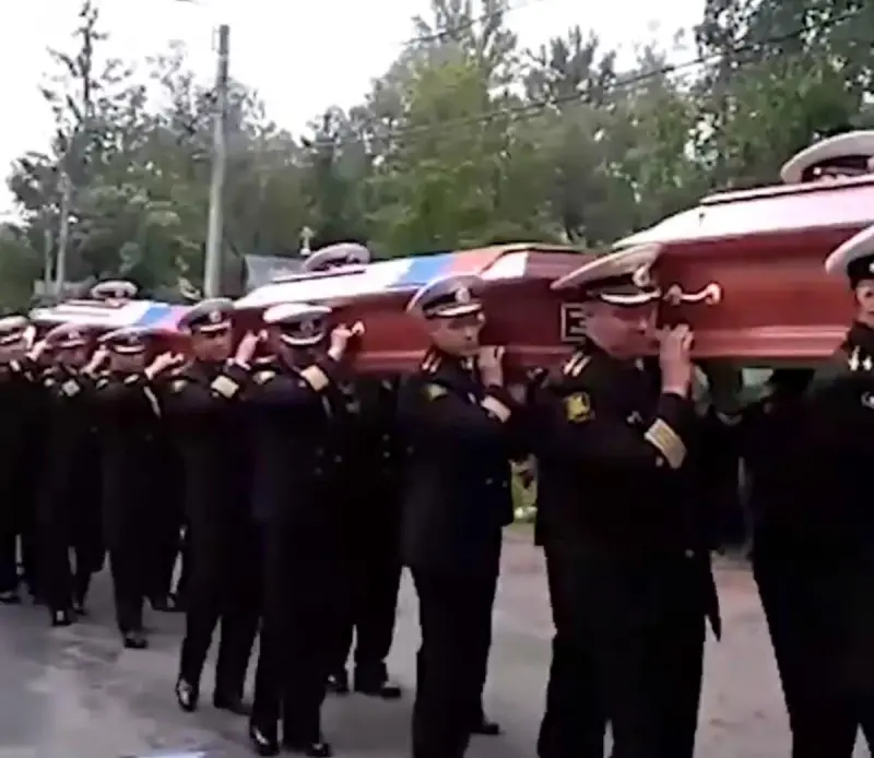 «Херассе, похоже, гробы действительно из листового свинца, раз 6 крепких мужиков аж шатаются когда несут и двумя руками вынуждены держать», - сообщил один из пользователей Twitter, который разместил видео с похорон подводников.