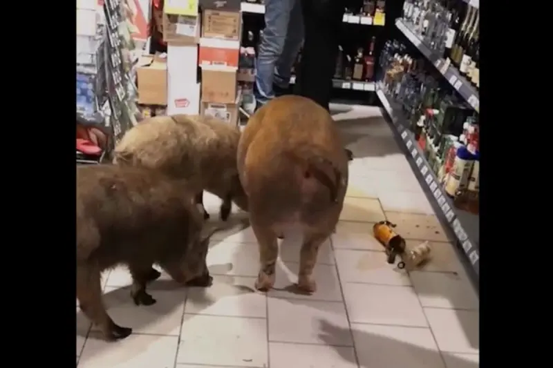 В российской глубинке, городе Тюмень, тройка свиней прорвались в отдел спиртных напитков супермаркета cети Пятерочка, разбили несколько бутылок и напились алкоголя.