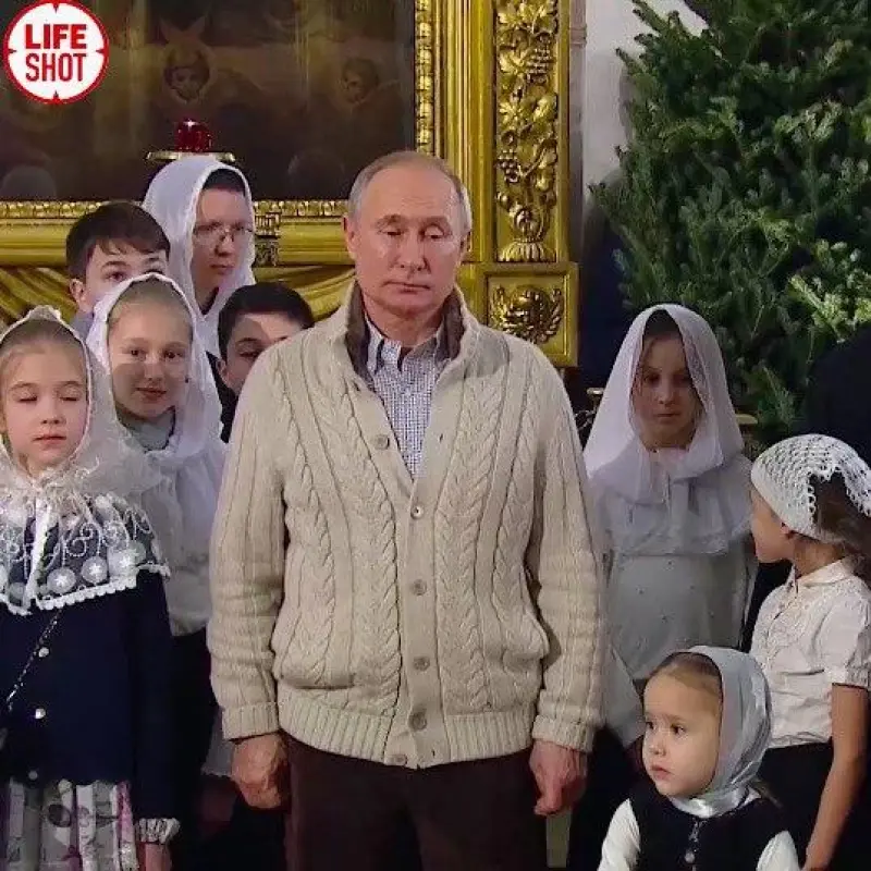 При этом выглядел Путин на рождественской службе непривычно. Хозяин Кремля был одет в коричневые брюки, рубашку в белую и синюю клетку, а также вязаный кардиган с меховым воротником. РосСМИ растиражировали фото Путина в окружении детей, а журналист Кремля Дмитрий Смирнов обнародовал в Twitter видео со службы.