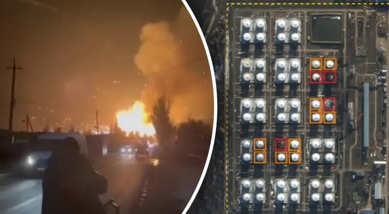 Анализ снимков от 21 января 2025 года обнаружил 4 оценочно уничтоженных резервуара ГСМ и 10 оценочно поврежденных резервуаров ГСМ.