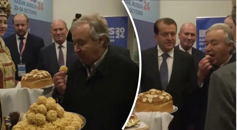 Российские пропагандисты опубликовали кадры того, как генсек ООН радостно ест каравай и татарский чак-чак из рук девушки в "национальном русском наряде" с кокошником в аэропорту Казани.