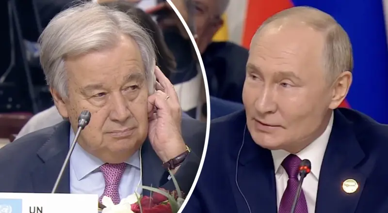 Все это время Гутерриш терпеливо кивал, сидя в наушниках, а Путин улыбался.