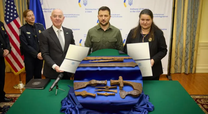 Министр внутренней безопасности США Алехандро Майоркас и посол Украины в Соединенных Штатах Америки Оксана Маркарова подписали сертификат передачи артефактов.